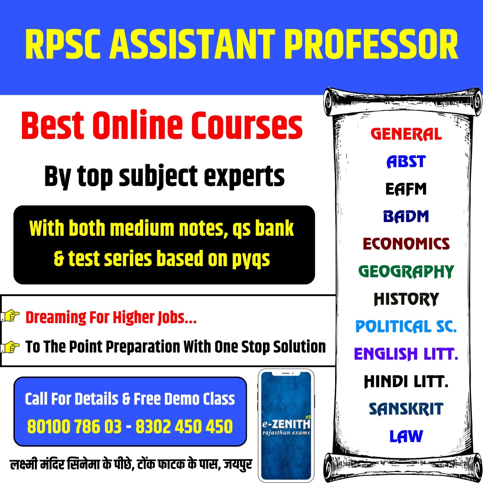 Best Online Courses For RPSC Assistant Professor Exams in Rajasthan for abst, eafm, badm, economics, geography, history, political science, english literature, hindi literature, general paper etc. *lectures by top educators *bilingual notes, qs bank & test series based on pyqs. *to the point content *your one stop solution for highest dream job CALL FOR DETAILS Download App : e-zenith #1 (RAJASTHAN) https://play.google.com/store/apps/details?id=co.alicia.pgicm