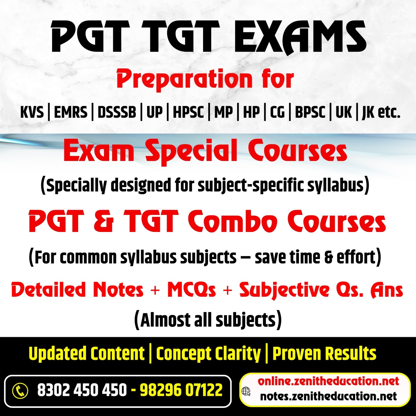 Prepare smartly for PGT & TGT exams with exam-focused courses specially designed for KVS, EMRS, DSSSB, UP, HPSC, MP, HP, CG, BPSC, UK, JK and other teaching recruitment exams. What You Get: ✔ Exam Special Courses for subject-specific syllabus ✔ PGT & TGT Combo Courses – 1 Course for Many Exams ✔ Detailed Notes + Exam Pattern MCQs + Subjective Questions & Answers ✔ Coverage of almost all major subjects ✔ Updated content with concept clarity and proven results Designed for aspirants who want structured preparation, smart syllabus coverage and time-saving study strategy. 📱 Online Courses – Zenith Education Jaipur • Online Courses available for AP, NET JRF, Grade, PGT, TGT, RAS, PCS and other competitive exams • Android App: https://play.google.com/store/apps/details?id=co.alicia.pgicm • Web: online.zenitheducation.net • iOS Users: Download Classplus App → Org Code: pgicm 📚 Notes & E-Books – Zenith • Buy Hard Copy Notes & E-Books (Read Only) • Android App: https://play.google.com/store/apps/details?id=co.tarly.xbcpp • Web: notes.zenitheducation.net • iOS Code: xbcpp PGT TGT preparation, PGT TGT online courses, teaching exam combo course, PGT TGT notes, KVS preparation notes, DSSSB teaching exam preparation, exam special courses for teachers, online teaching exam study material, PGT TGT MCQs and subjective questions, combo course for teaching exams.